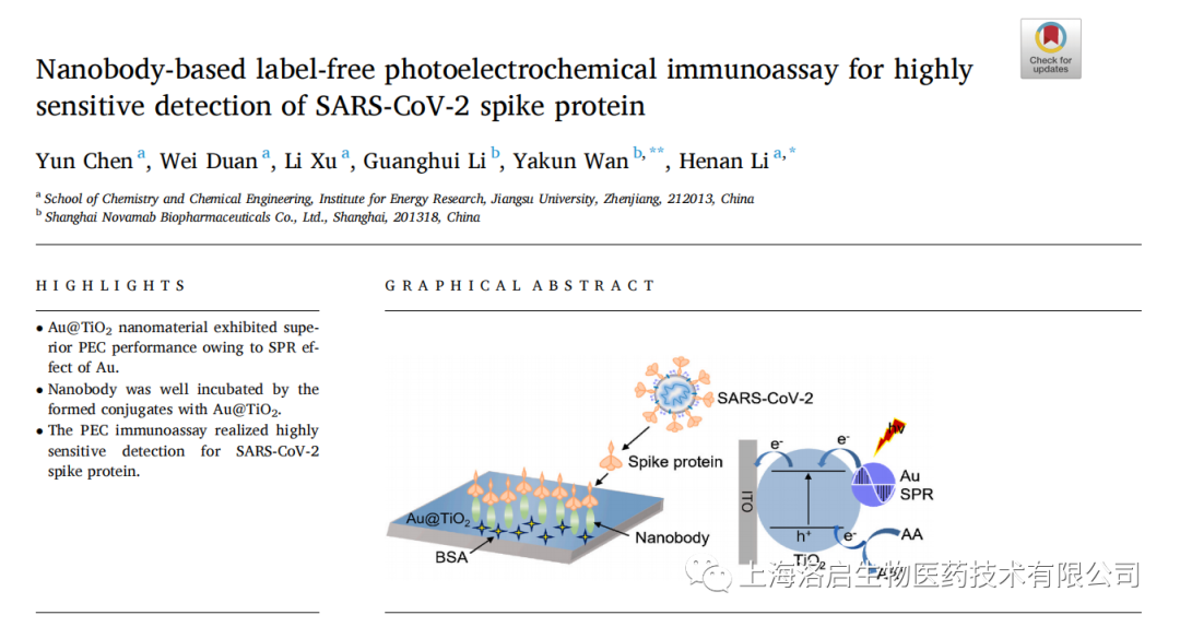 2022年5月3日,九州酷游 ku游生物和江苏大学化学化工学院李赫楠教授团队合作,在《Analytica Chimica Acta》发表了题为“Nanobody-based label-free photoelectrochemical immunoassay for highly sensitive detection of SARS-CoV-2 spike protein”的研究论文。九州酷游 ku游生物万亚坤博士和李贺楠教授为并列通讯作者,相关纳米抗体的知识产权归九州酷游 ku游生物所有。